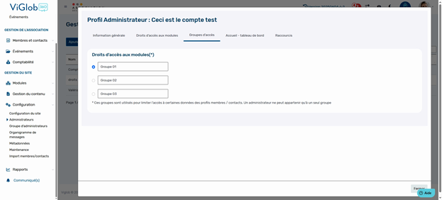 L'onglet Groupe d'accès permet de restreindre l’affichage de certaines données de profils membres ou contacts. Trois groupes maximum peuvent être créés : pour chaque champ de fiche, indiquez qui peut y accéder. Si vous n'utilisez pas ces groupes, vous pouvez laisser cette section tel quel.