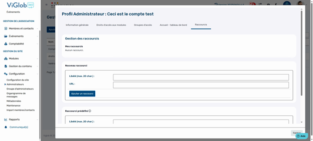La section Raccourci permet de créer des favoris pour un accès rapide à des fonctionnalités spécifiques. Attention à ne pas ajouter de raccourci vers un module non accessible par la personne. L'administrateur pourra également gérer cette section lui-même