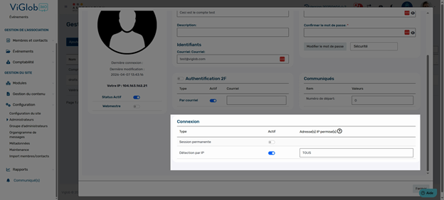 La section Connexion permet de choisir si l’administrateur a une session permanente ou si son accès doit être restreint à certaines adresses IP – pratique pour limiter l'administration à un bureau physique, par exemple.