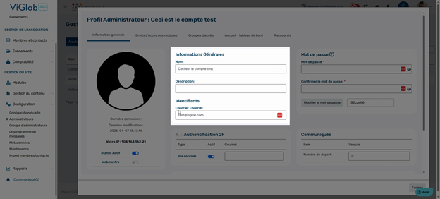 Dans Informations générales, il est possible de modifier le nom, la description ou l’identifiant de l'administrateur.