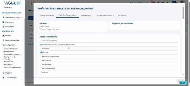 Si jamais un administrateur ne trouve pas les modules qu’il devrait voir, vérifiez dans son profil que les bons accès sont cochés.