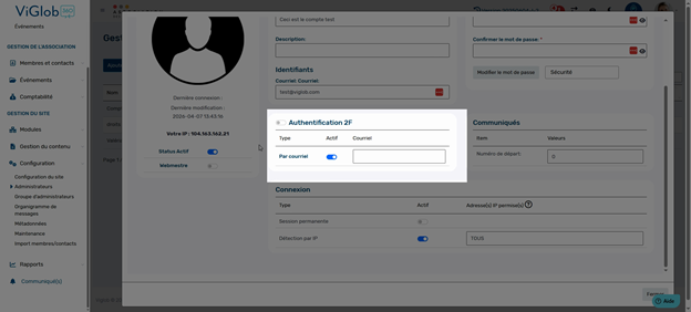 Un peu plus bas, l’option d’activer l’authentification à deux facteurs renforce la sécurité. Avec cette activation, la personne devra valider chaque connexion via un code reçu par courriel en plus de son mot de passe.